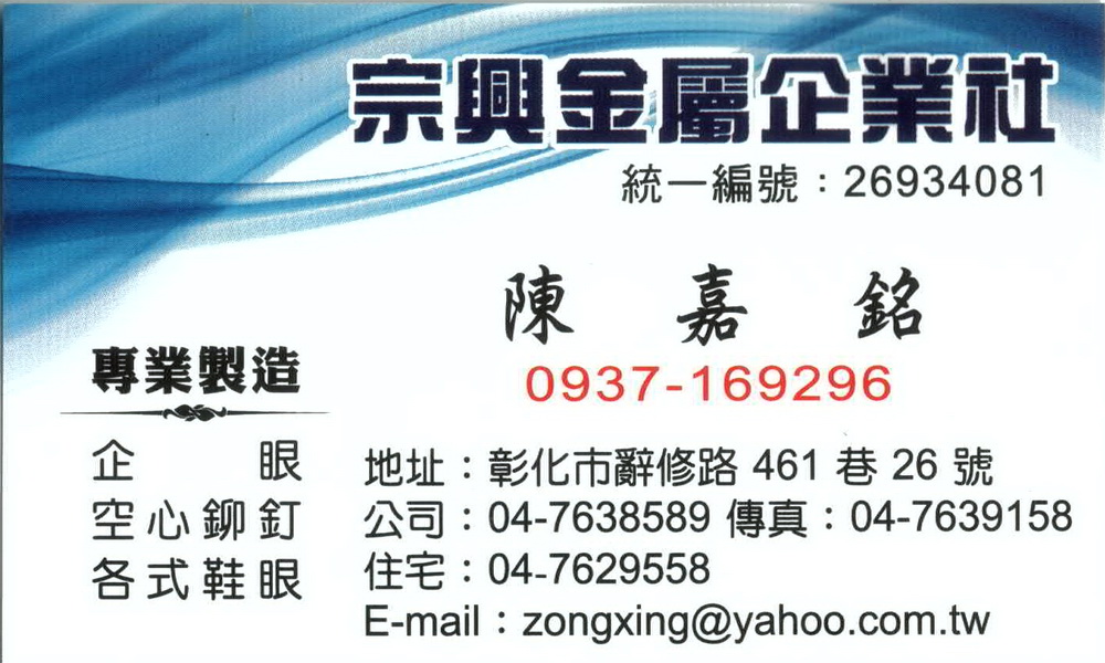 No.26, Ln. 461, Cihsiou Rd., Changhua City, Changhua County 50059, Taiwan (R.O.C.)電話:04 - 7638589傳真:04 - 7639158信箱:zongxing589@gmail.com